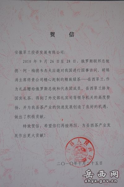 2010年9月底,国家主席胡锦涛将安徽翠兰投资发展有限公司生产的岳西翠兰赠予来我国进行国事访问的俄罗斯联邦总统梅德韦杰夫及其代表团成员,使岳西翠兰享国礼茶殊荣。为此,岳西县人民政府对安徽翠兰投资发展有限公司致信,表示祝贺。贺信全文如下: