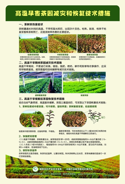 为应对我县当前出现的高温旱害,有效开展茶园减灾和恢复技术指导服务,现将最新《高温旱害茶园减灾和恢复技术措施》挂图(昨天刚刚定稿)在网上发布,供各地在茶园抗旱减灾工作中参考。