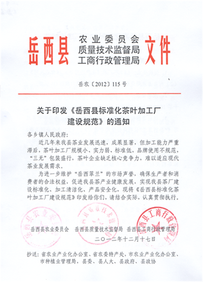 4、产品质量要求:企业要恪守职业道德,诚实守信,规范加工,鲜叶原料必须来自岳西县境内,严格按照《岳西翠兰茶》(DB34/T430-2004)和《无公害岳西翠兰生产、加工技术规程》(DB34/T431-2004)的质量要求进行分级加工。绝不能以次充好、以假充真,确保产品质量。