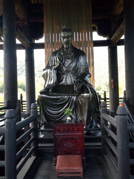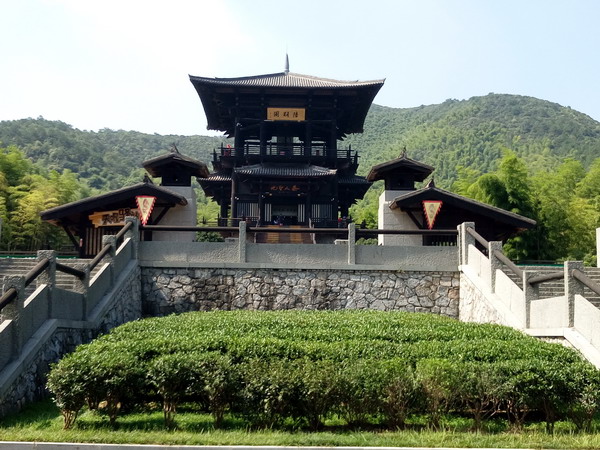 历史上“茶厂式”的紫笋贡茶院几经兴衰,最后在上世纪30年代彻底消失在战火之中。今天见到的是2000年后在原址上重构的一处文化景观。这里,背靠秀丽多姿的顾渚山峰,面朝洪波叠起的浩瀚太湖,占地一百多亩,仿唐风格,既古朴典雅,又气势恢弘。走进贡茶院,沿中轴线拾级而上,左右两侧鸿渐楼、桑苎台、燕乐园、御羁园,遥相呼应,前方最高处是陆羽阁,阁后是吉祥寺。寺院重点以塑像图文,昭示茶禅一味之妙。陆羽阁高耸云天,雄居景区中心,三楼之上,四面凌虚,中供高3.5米、重2.5吨《陆羽著茶经》铜像一尊。高阁青山环抱,白鹭,飞鸿,时不时从远处飞来,盘旋良久,恰似1200多年前在湖北龙盖寺,以羽翼呵护着这位后来以“羽”为名、功垂青史的弃婴。