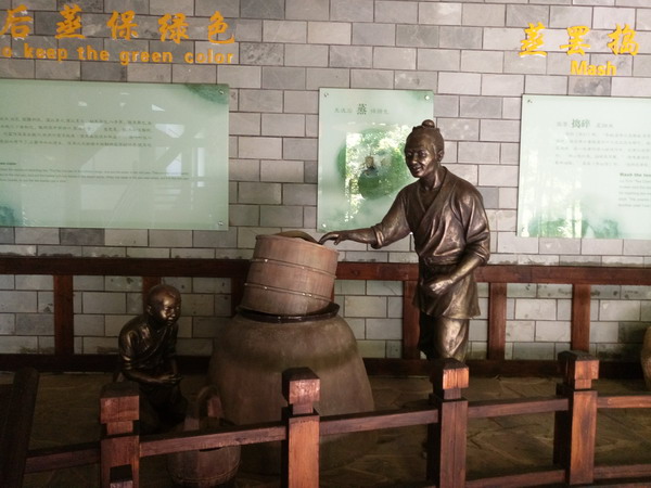 贡茶院楼宇寺庙以廊亭相连,廊亭分段置景,区格分明,呼应一气,建造者的匠心与技艺,令人不得不由衷叹服。走在廊亭,一路唐二十八位贡茶刺史像、历代碑文石刻、名家字画,让人目不暇接;茶具、茶点、茶服、茶玩,件件都是珍品。贡茶制造区,以与真人同等大小的镀铜人物像和老器具相组合,还原当年紫笋贡茶制作的过程与要领,栩栩如生,一目了然。