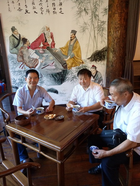 御羁园,贡茶院内最大一处吃茶的地方。因为天日向晚,诺大的茶厅,只有蔡君、刘君和我三位茶友,显得格外空旷。参观完大部分景点,正好有点累、有些渴。服务女生面带微笑,沏上一盏紫笋,外加两碟茶点,真的适逢其时。自从明太祖朱元璋下令罢造龙团凤饼,世人便不再看好饼茶,我们所享用的紫笋,当然也不是当年模样。本山鲜叶,经现代设备杀青、烘焙至干,色泽淡绿,嫩叶包芽,精致而纯净;细磁天地杯中,芽叶吮吸顾渚山初沸的泉水,渐渐舒开曼妙身姿,或沉或浮,或上或下,缕缕茶烟升起,或聚或散,或即或离,一切随性随缘,看不出半点忧虑。虽然因为店家在茶中加了些干花,冲淡了部分茶味,但整体感觉还是滋味醇厚,意韵悠长。