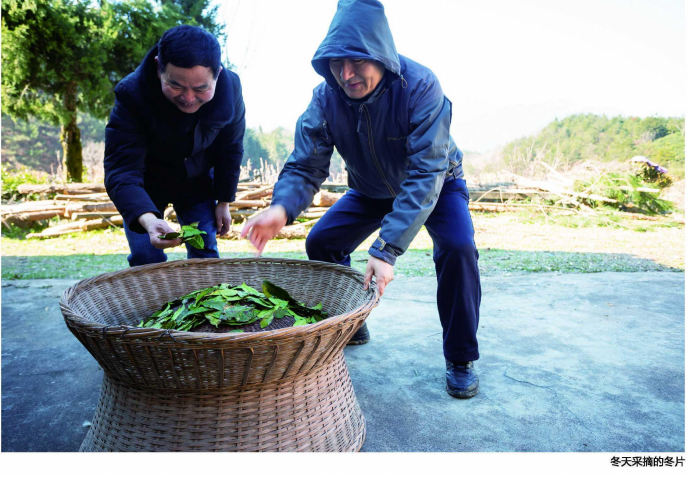 采茶是冬茶加工工艺的开始。屋后山坡上种植着王老家的茶树。不大的茶园里,大家围着王老师,看他手把手地教我们采摘。他强调:“这的冬 茶采摘要选在冬季下过一两场雪之后的晴天,采摘茶树上当年新梢中部的叶片,最好是5片叶子以上,并且要无病斑,无虫蛀,无黄片,无嫩尖,老嫩适中,绿亮敦厚。”大家在王老师指导后便开始争先恐后的采摘茶叶,不一会儿,就采完了大半筐茶叶。采完的鲜叶由老奶奶进行炒茶,只见她拿起一小把野花擦热大铁锅,她说这是金银花(又叫云冬),这样擦完锅再炒,会让冬茶品质更好。接着,老奶奶拿来一把竹制铲开始炒头锅,王老师还旁边补充说“最好用新鲜竹子制作的铲最好。”不一会儿,大火炒完了头锅,再将茶叶放入旁边火温较低的锅里炒二锅。随着二锅的完成,王老师在屋前的地上摆上了大竹笼,准备烘焙,老奶奶将二锅里的茶叶均匀地铺在大笼子上。王老师说只要保存得当,并且每年在梅雨季节再复烘干燥,冬茶可以保存十年之久。