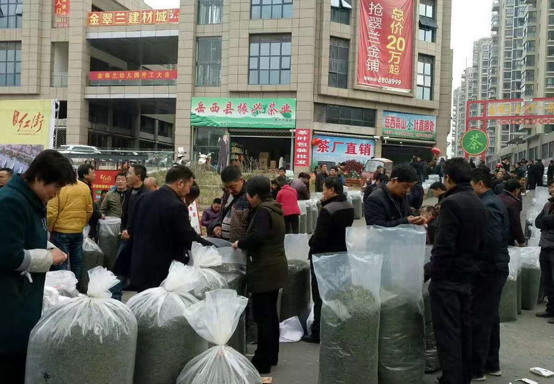 随着岳西春茶上市的增多,4月份以来入市交易的茶农持续增加,每天都有1000-2000余人,入驻茶城门面设点收购的茶叶商家90多家,交易十分火爆。